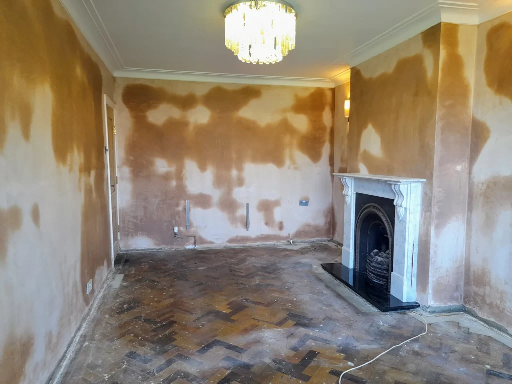 To address the rising damp, we began by removing all the old plaster back to the brickwork to a height of 1,200mm around the entire room. This ensured that all potentially affected areas were exposed and could be properly treated.