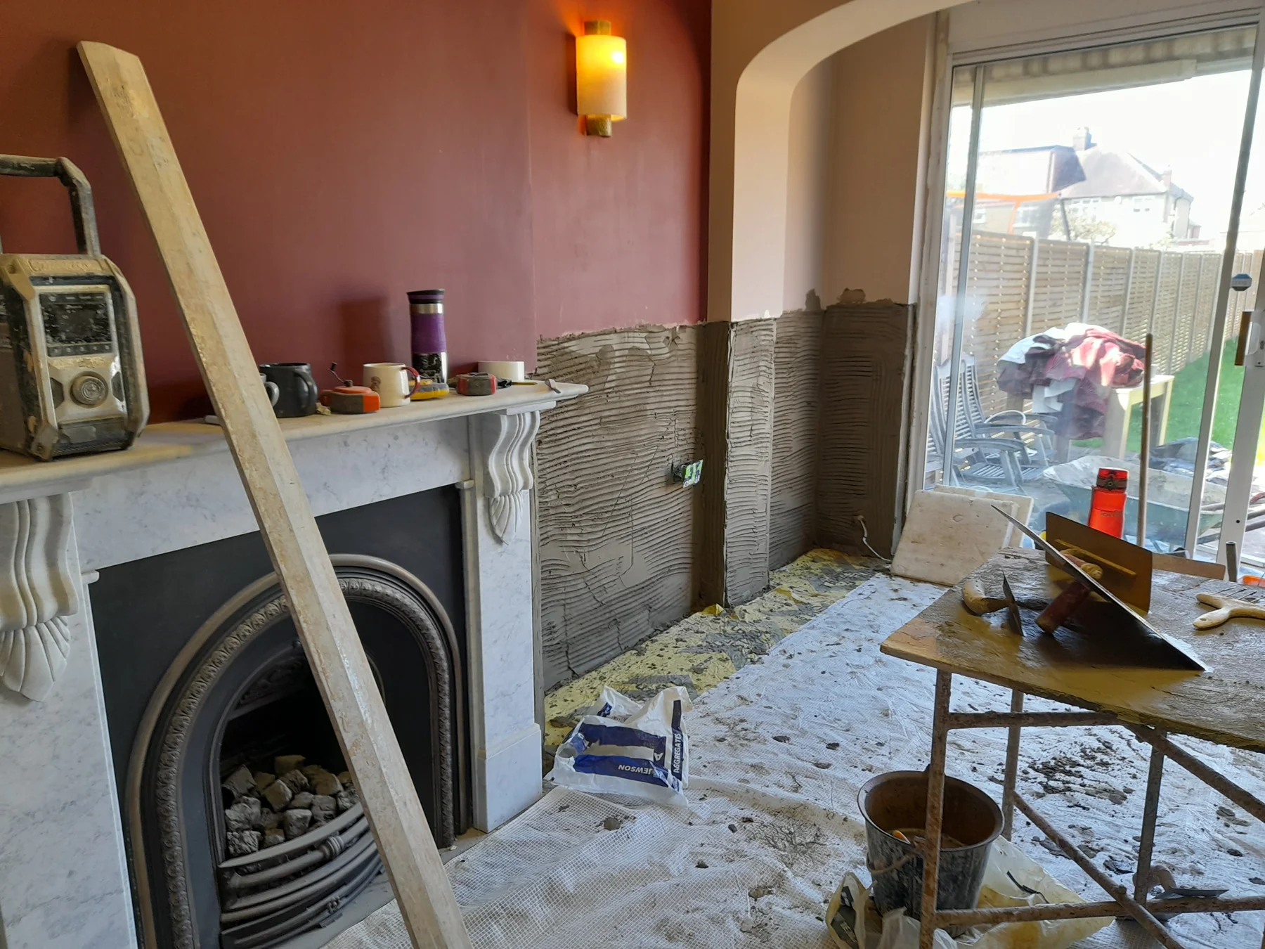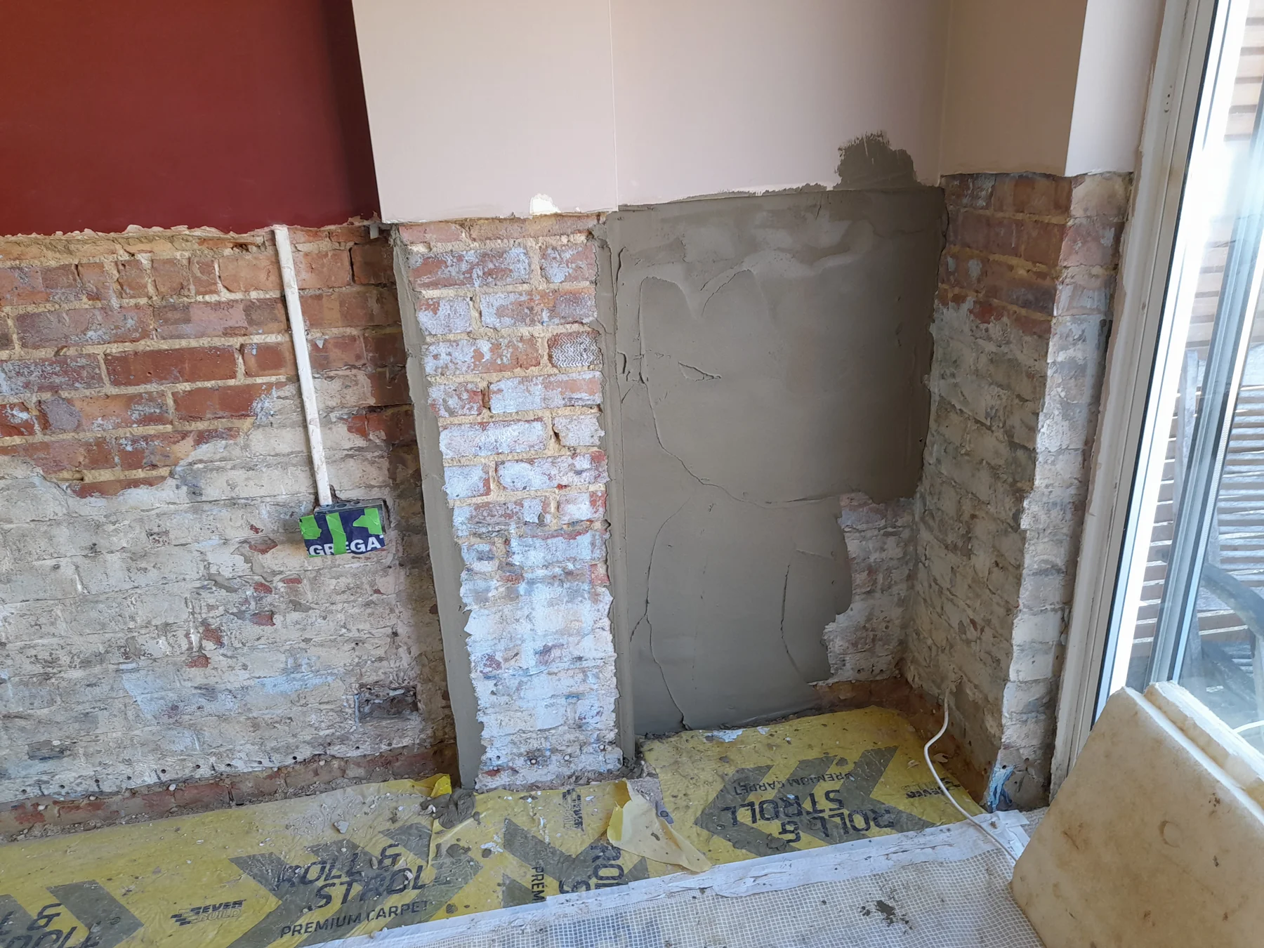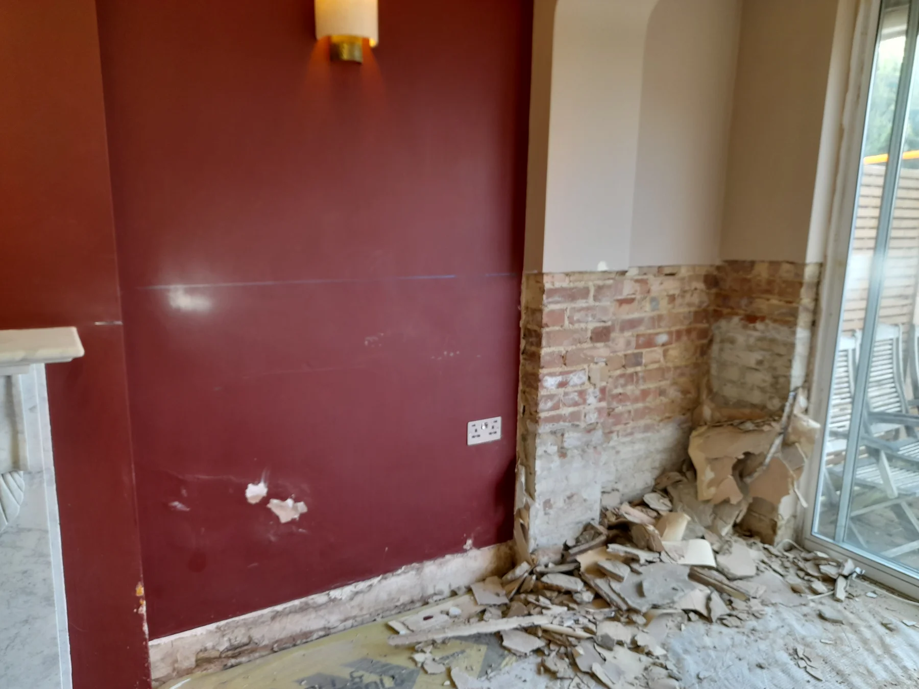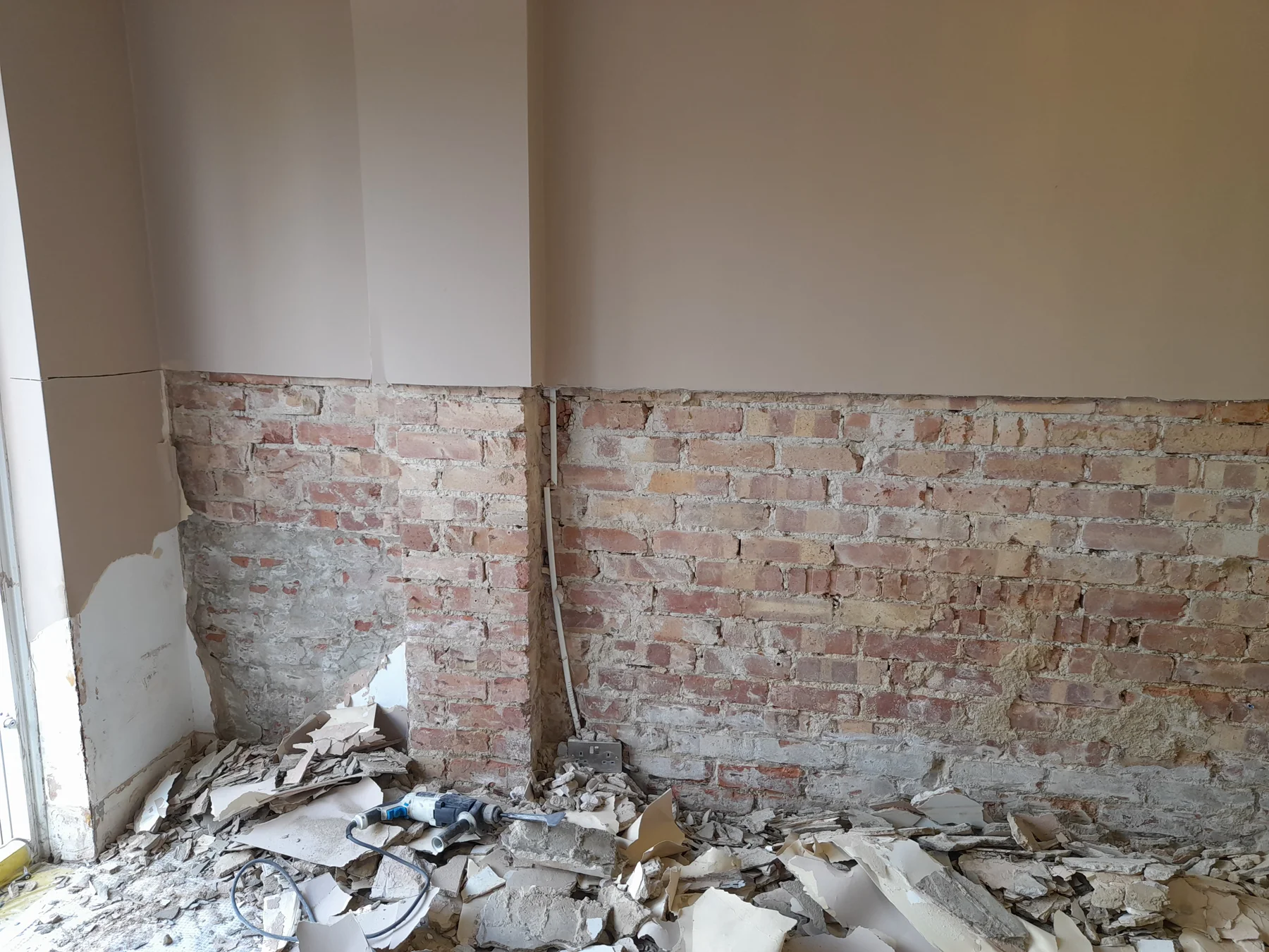 To address the rising damp, we began by removing all the old plaster back to the brickwork to a height of 1,200mm around the entire room. This ensured that all potentially affected areas were exposed and could be properly treated.